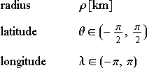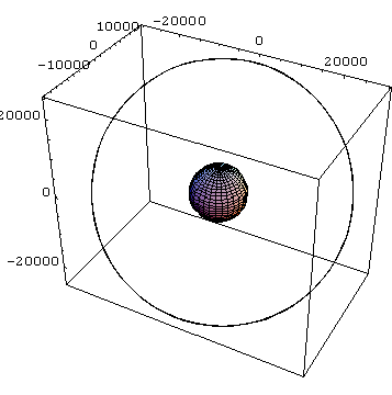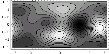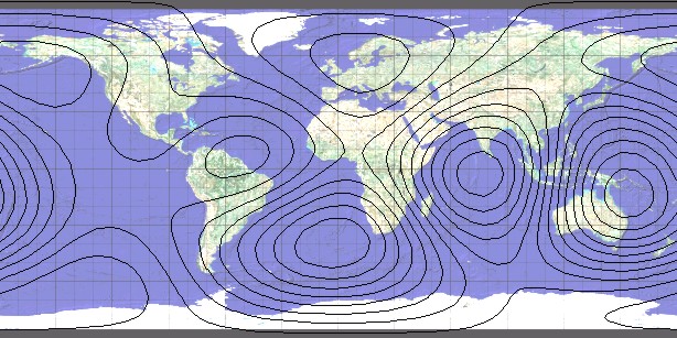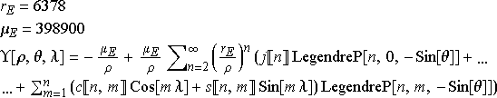 Because of the radial symmetry, the potential function of the gravitational field is formulated as a spherical harmonic expansion with coefficients j, c, and s (see the details below). The plot aside coutours the potential function at Earths surface level, where rho=rE, and j(2) is set to zero, to enhance details.