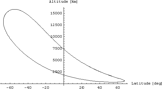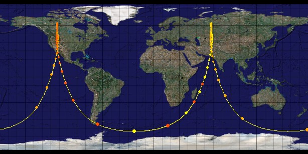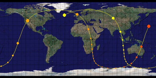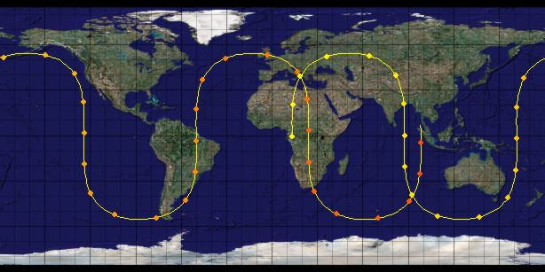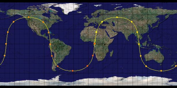 We plot several instances of satellite ground tracks. The points are spaced equidistantly in time and evolve from yellow to red. Click on the images, for a 3d view of the orbits.